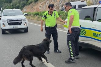 Zincirleme kazadan sonra yol ortasında kalan köpeğe polis sahip çıktı