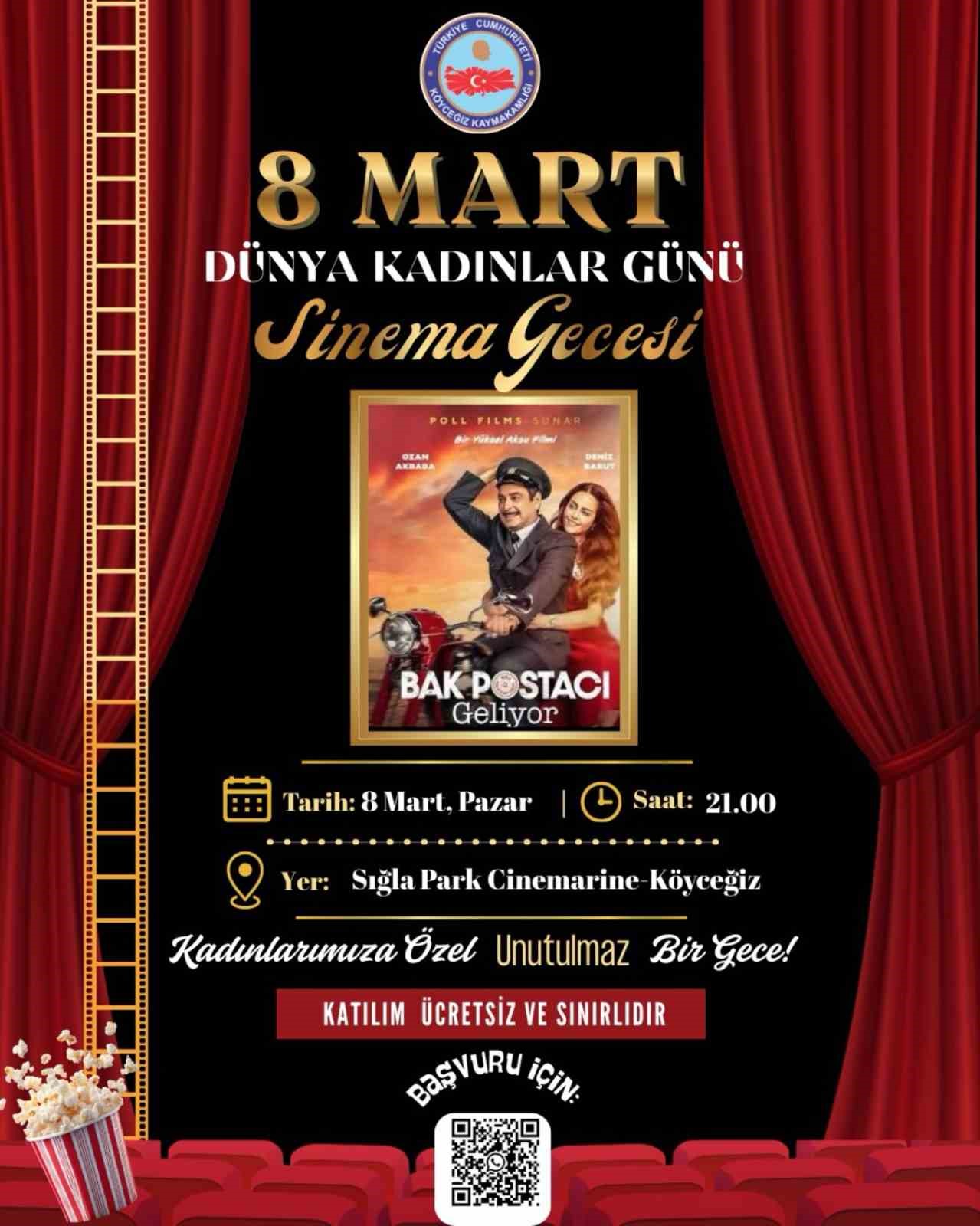 Köyceğiz Kaymakamlığı tarafından, 8 Mart Dünya Kadınlar Günü kapsamında kadınlara özel sinema gecesinde ‘Bak Postacı Geliyor’ filminin gösterimi gerçekleştirilecek. ‘Bak Postacı Geliyor’ filmi 8 Mart Pazar günü, Saat 21.00’da bir işletmeye ait sinema salonunda kadınlara özel gösterime sunulacak. Köyceğiz Kaymakamlığından yapılan açıklamada, “Kadınlarımızın bu özel gününü birlikte, keyifli bir sinema akşamı ile taçlandırmak istiyoruz. Katılım ücretsiz ve sınırlıdır. Tüm kadınlarımız davetlidir” ifadelerine yer verildi.